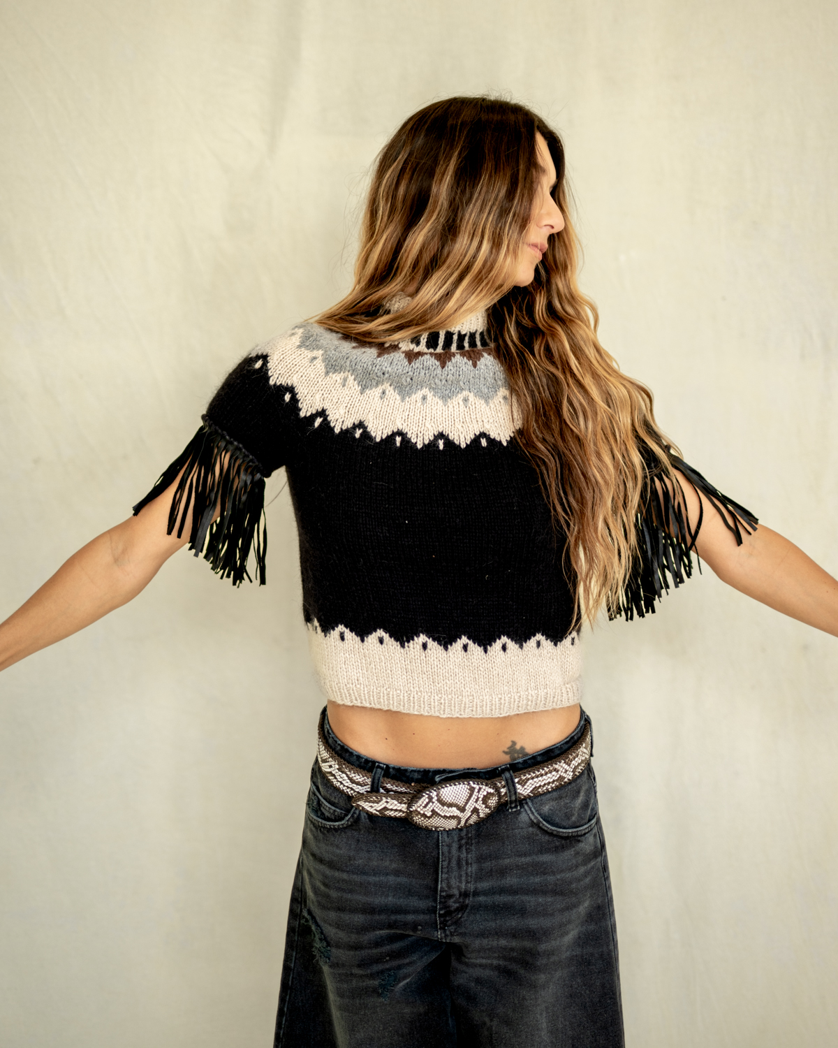 Inspired on the northern argentine culture, the Paco Sweater was the first item of our knitwear collection. Made with 100% merino wool, this round neck features a leather fringe on each sleeve. Hand knitted in Argentina.