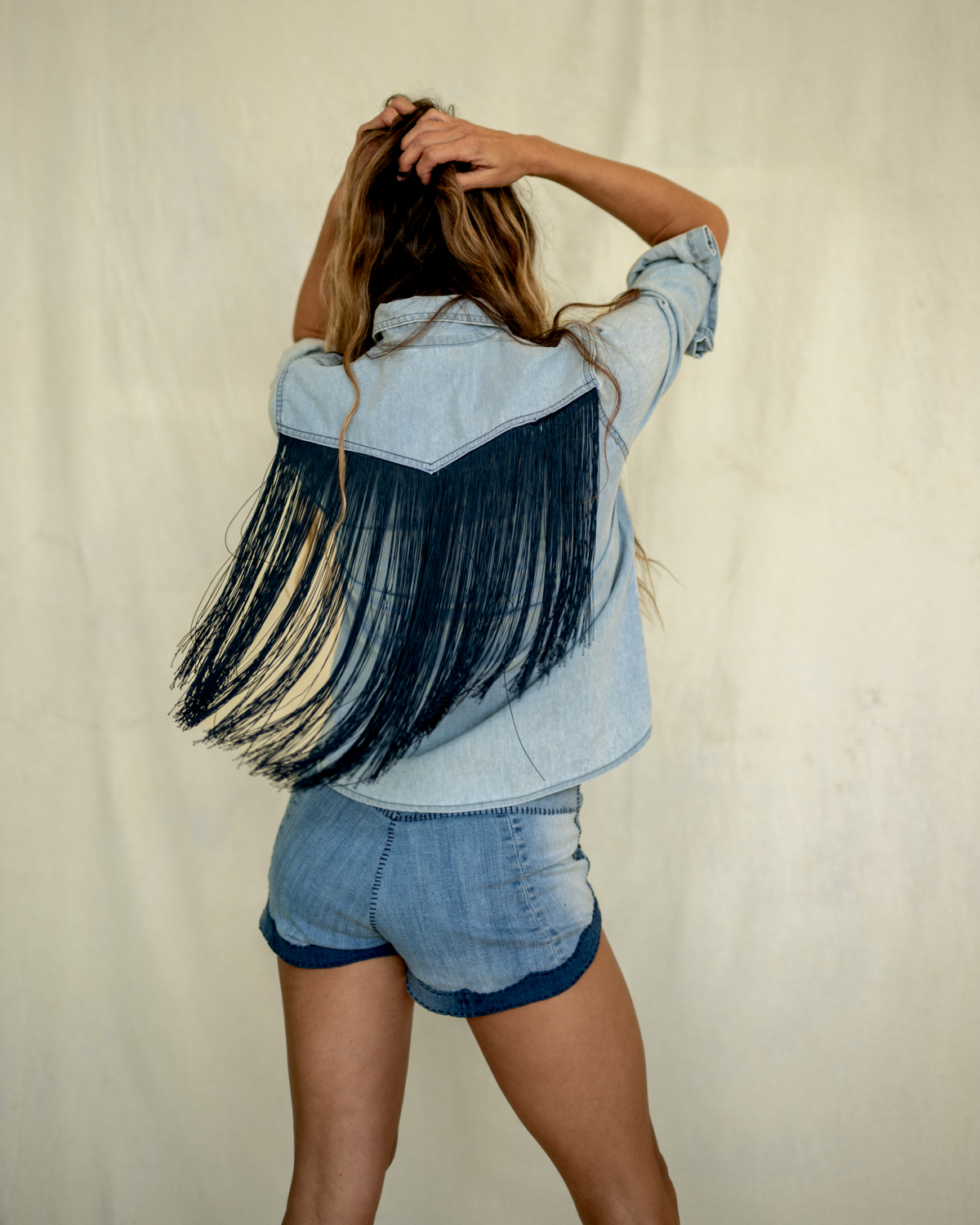 A new version of the classic western style denim shirt with iconic front pockets and silky fringes details.